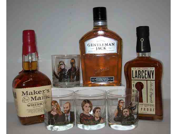 A bottle of Larceny, Makers Mark and Gentleman Jacks Bourbon Whiskey and a set of 4 Bucket Glasses from Season 6 of the Hit Show Arrow.