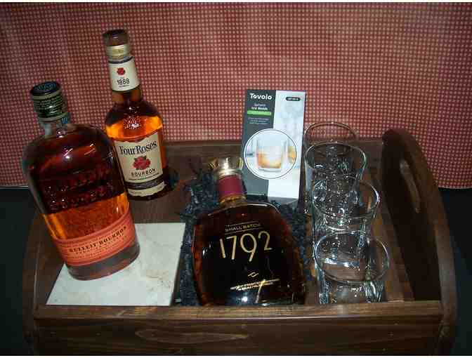 A bottle of Bulleit, Four Roses and 1792 Bourbon Whiskey with 4 Rocks Glasses and a Set of Ice Sphere Molds