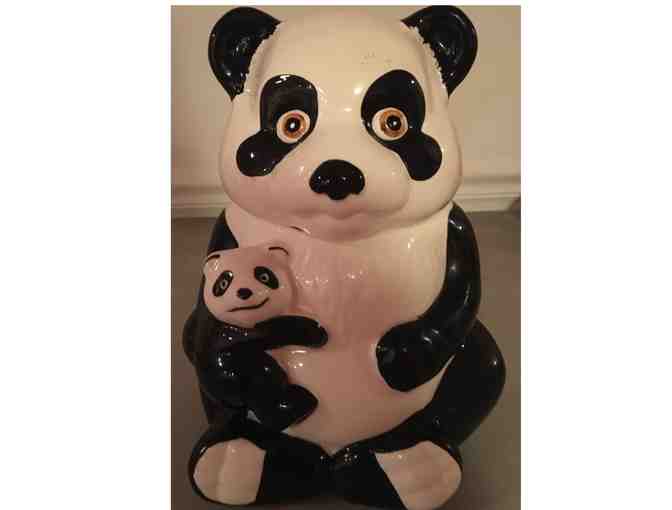 Large vintage ceramic cookie jar; black and white panda bear holding baby