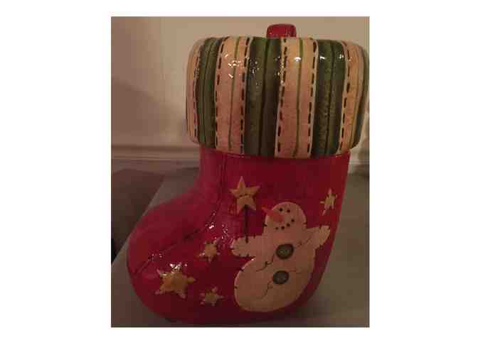 Vintage ceramic Christmas boot cookie jar by Linda Spivey decorated with green and white stripes and a friendly snowman on the front