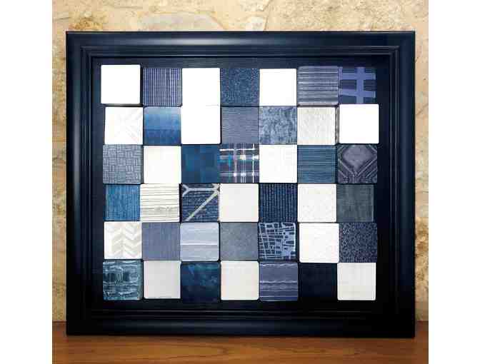 This handcrafted 3-dimensional wood block mosaic wall art was created specifically for the Michael Hoefflin Foundation. Various lengths of 3 ½” square pine blocks are attached to a wood substrate, affixed to a solid frame and painted in an egg shell finish latex paint. The top of each square is covered with a commercial wallcovering sample creating a unique and interesting wall art featuring texture, pattern, color and tone.