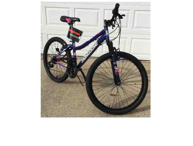 Hard time finding a bicycle this summer? We have one for you! Girl's Mongoose 24" Inertia mountain bike; black with pink accents.