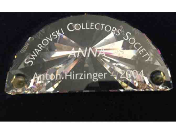 The Anna plaque is made from clear crystal with 2 yellow stones. The painted inscription reads Swarovski Collectors Society ANNA Anton Hirzinger - 2004. Issued 2004, retired 2004.