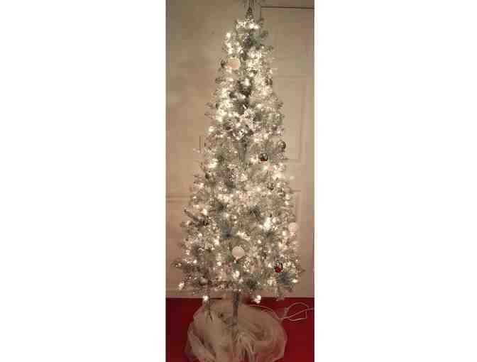 Make it a shiny Christmas with an elegant silver and white artifical 6.5 ft tree; lighted and decorated with silver balls and fluorescent stars