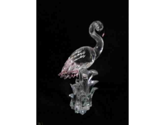 This retired Swarovski crystal Flamingo was part of the "Feathered Beauties" collection. Bring home the elegant flamingo as it wades in shallow waters. Its body comes in faceted clear crystal with unacted clear crystal neck, head, legs and water. The feathers have Rosaline crystal accents and the beak is in Rosaline and Jet crystal. Designer Gabriele Stamey. Issued 2002, retired 2011.