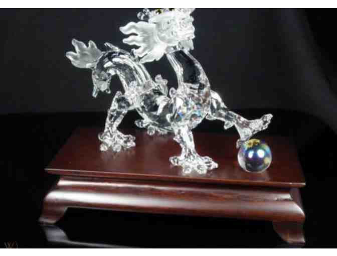 This Swarovski crystal dragon was part of the "Fables and Tales" grouping. The Asian symbol of good luck, the dragon is made from faceted clear crystal and Light Topaz eyes, has smooth and matt crystal details and a crystal ball. It comes on a beautifully polished teak wood stand. Designer Gabriele Stamey. Issued 1999, retired 2013.