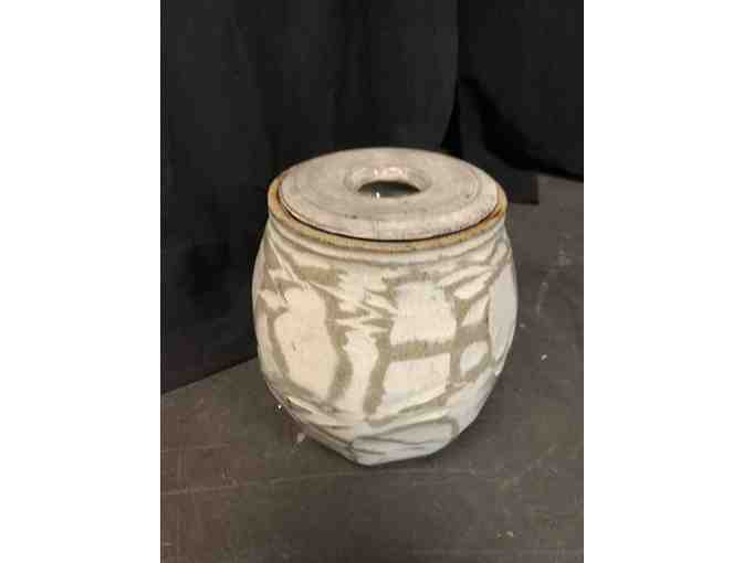 Faceted Jar with inset lid. 6" X 5" Bi-colored surface decoration. Color celadon/brown.