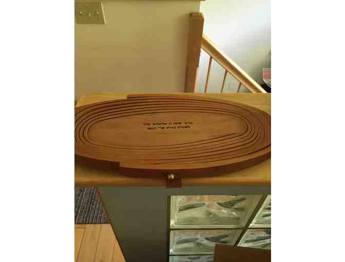 Wooden Challah board turns into a basket. Has the blessing in Hebrew printed on the board.