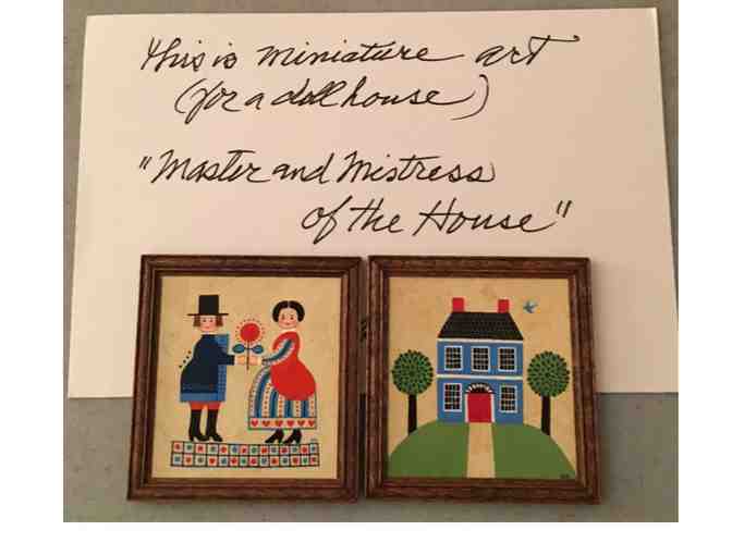 Miniature artwork for a doll house; "Master and Mistress of the House" along with a miniature wall decor of a bouquet of flowers. Artwork created by Sharon Kane, MHS Alum!