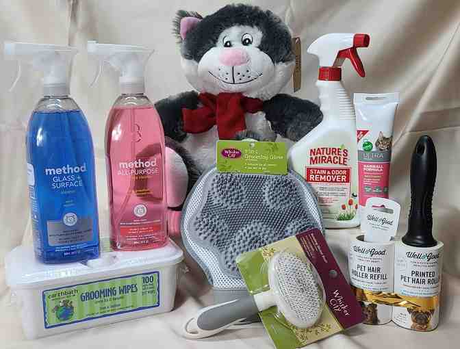 Cats may keep themselves clean but what about the rest of your house.  These pet friendly products will make your house shine and keep your cat, your clothes and cat looking great. Package includes a Whisker City grooming glove, lint brush, cat toys, Nature's Miracles stain remover, hairball formula, hypo-allergenic pet wipes, pet-friendly glass and mutli-cleaner and a cat brush. No licking required!