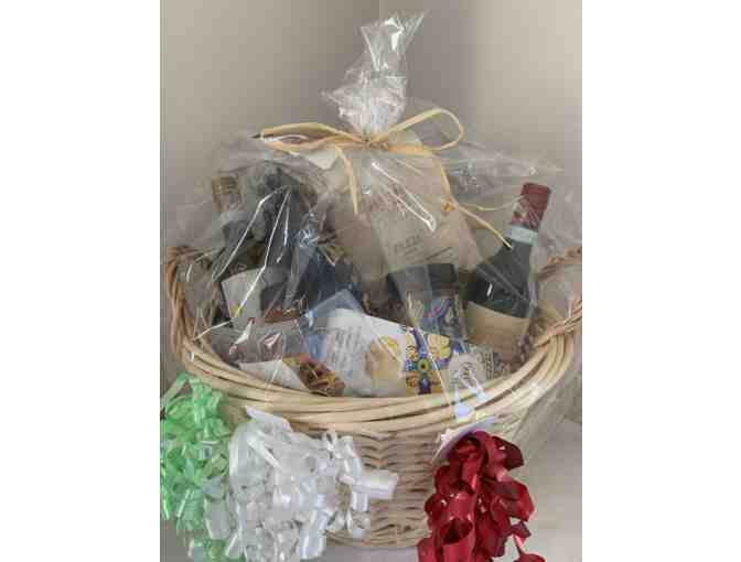Italian Eats Basket includes, red and white wine, pasta and sauce, olive oil, balsamic vinegar, salami, dried tomatoes, marinated vegetables, cookies and more! In person pickup, cannot be shipped.