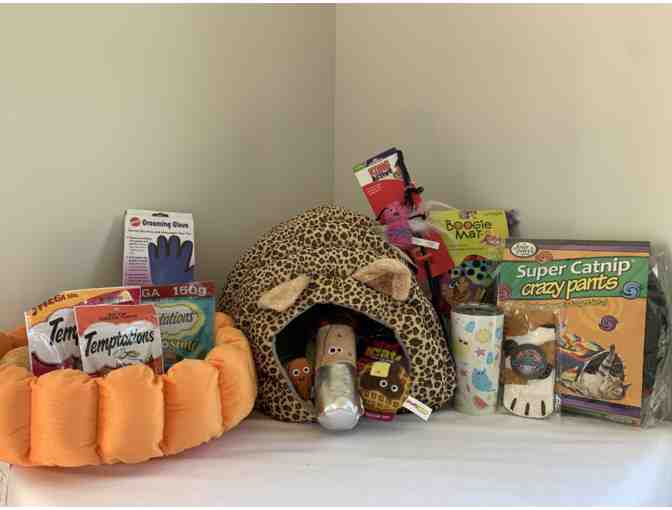 The ultimate basket for cat lover's! Cat toys, treats, grooming gloves, cat travel mug, a cave and bed for your cat and much more!