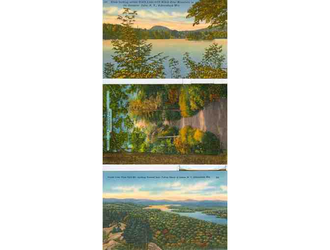 Unique Adirondack postcards depicting Sixth Lake with Black Bear Mountain in the distance in Inlet, Fourth Lake from Bald Mountain looking toward Inlet, and a woodland trail in the Adirondack Mountains.