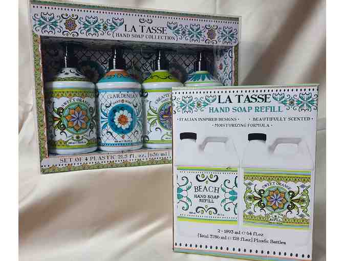 Instantly dress up your kitchen or bathroom with this La Tasse collection of hand soaps. Four (4) scented hand soaps are included; Sweet Orange, Gardenia, Creamy Coconut and Beach scents. A beautiful addition with a Tuscany flair. Includes refill.