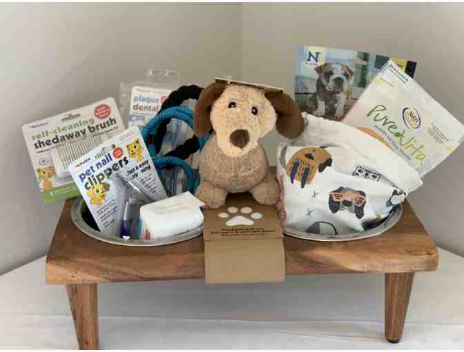 Comes in a large bone shaped basket and includes: food and water bowl set in wooden stand, shedding and dental kit, treats, a plush toy, leash and more!