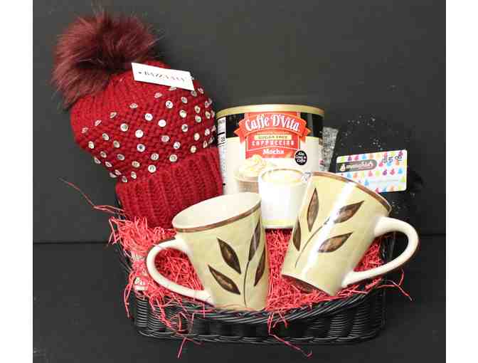 Bazarra Winter Hat, 3-Pack Multiwear Socks, 2 Coffee Mugs, 1 Can Powder Caffe D'Vita Cappuccino Mocha Drink (Sugar-free) 1.5lbs and a $5 Menchies Gift Card.