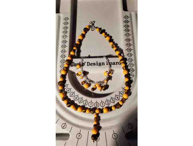 You'll be walking in style this fall if you are the winning bid for this necklace and bracelet set, designed by Karen Bond of Central MO.  This necklace is an 18" beaded necklace in fall colors with Sterling silver findings and a 7.5" sterling silver bracelet with fall color bead dangles. Value $60.