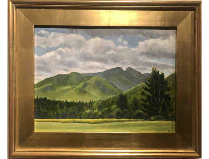 Original, framed, oil painting on linen by Saranac Lake artist and ADK member Sandra Hildreth. It was painted on location at Marcy Field and includes the view of Upper & Lower Wolfjaw mountains. The painting is a one-of-a-kind piece, 12x16", plus a 3" gold frame.
