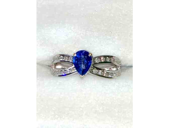 This beautiful 14K white gold ring will look stunning on someone special. It features a 1.09ct teardrop sapphire that is surround by .26 ct of diamonds. Don’t miss your opportunity to own this dazzling piece of jewelry.