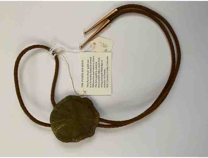 This Pyrite (fool's gold) sun is a formation in several Midwestern and western states. The bolo (gold in color) is handcrafted with a suede bolo string and gold filled tips to enhance its beauty. RJL Creative Crafts, Colorado
