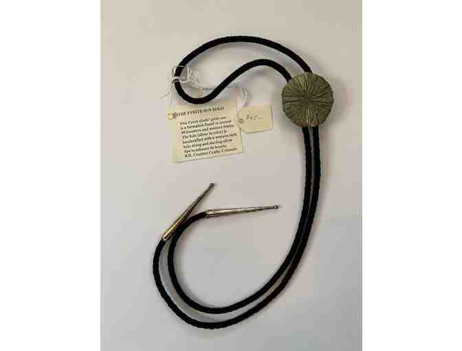 This Pyrite (fool's gold) sun is a formation in several Midwestern and western states. The bolo (gold in color) is handcrafted with a suede bolo string and silver filled tips to enhance its beauty. RJL Creative Crafts, Colorado