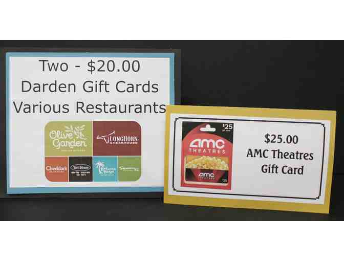 $25 AMC Theaters Gift Card, 2 - $20 Darden Restaurant Gift Cards, redeemable at Olive Garden, Longhorn Steakhouse, Cheddar's, Yard House, Bahama Breeze, Seasons.