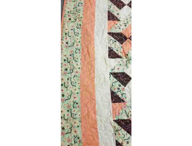 You'll be covered in peach , cream and green accents with this fine quilt made by Laura Burnham of the Nimble Thimbles Quilting Guild. Snuggle into a bed or snuggle up on the couch. This awesome artwork will keep your home in style!