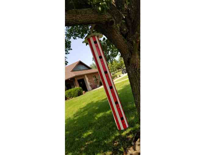 Celebrate America by hanging this 3ft tall bird house in your yard.  Finely crafted bird house featuring a tin roof in blue and stars with a body that is made of PVC pipe with Red and White stripes.  The birdies will be so happy to live in this fine multi-plex.