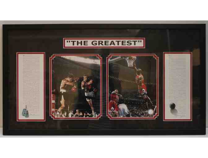This framed piece celebrates two of the greatest athletes ever, Muhammad Ali and Michael Jordan. Highlights of their respective careers and lasered signatures.