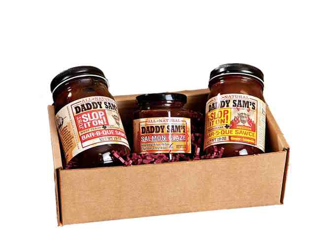 All three flavors of Daddy Sam's in a gift box! It's Daddy Sam's Original West Texas Bar-B-Que Sawce for the traditionalists, Daddy Sam's Ginger Jalapeño Bar-B-Que Sawce for those that like a bit of zip, and Daddy Sam's Salmon & Seafood Glaze for grilling your favorite fish and seafood. Just Slop It On!