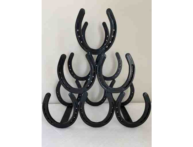 Rustic, handmade horseshoes wine rack in black finish. Wine rack will hold up to six bottles.