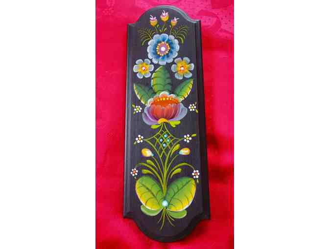 12" x 4" wall plaque painted in the Os style of Rosemaling. May be used as a key or jewelry hanger as well. Hook included.