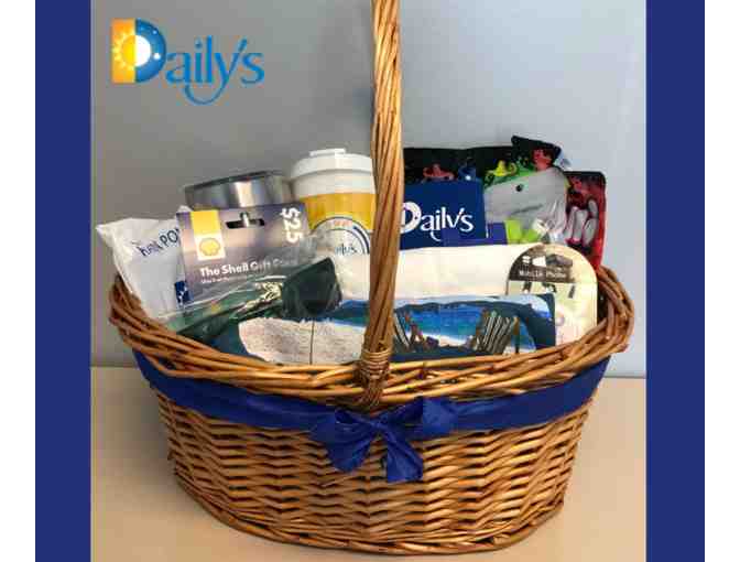 Enjoy this gift basket from Daily's Place that includes a $25 Gift Card, a Tumbler, reusable coffee cup, vouchers, T-shirts, Hand Sanitizer, and more!