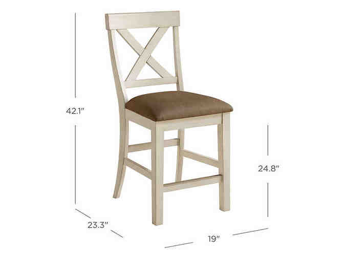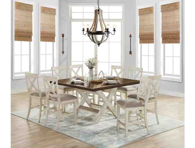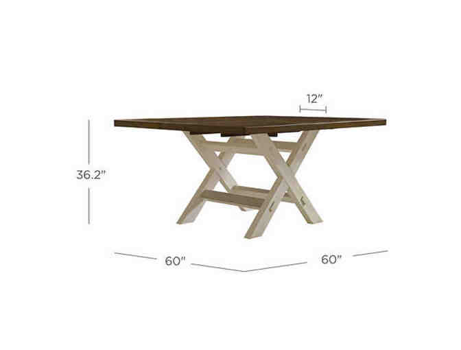 This modern farmhouse dining tabletop is plank style with Acacia solids and veneers and is supported by an off-white X-base. A 12" self-storing, folding leaf adds space when you need it. Comes with eight (8) matching chairs. Accessories in photo not included.