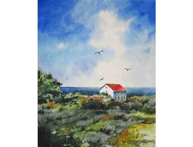 An original watercolor illustrating "Shack" on Star Island by watercolor teacher Walter Cudnohufsky.