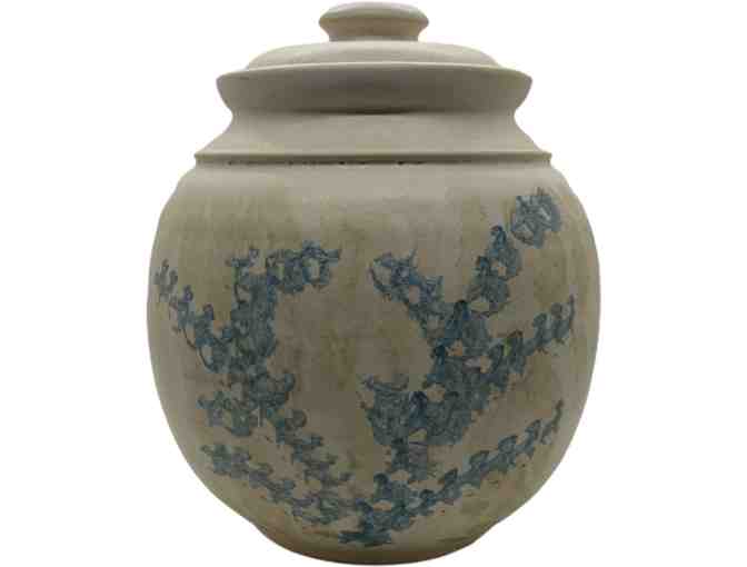"This pot was thrown on a potters wheel by Roman Blanchard who lives in north western Vermont. Each pot is also put back on the potters wheel and the bottom is hand-tooled. The glaze technique, known as majolica, is done by hand painting the colors on the raw opaque glaze after bisque. Then the ware is glaze-fired to a stoneware temperature. These glazes are non-toxic, dishwasher & microwave safe."