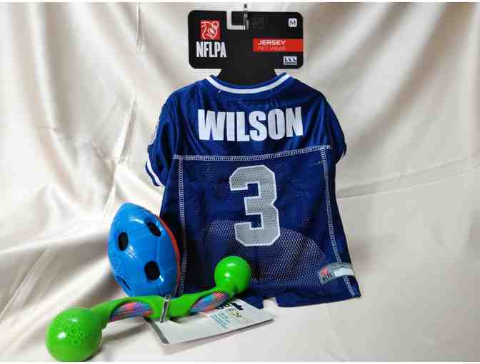 Make sure your whole family, including the four-legged ones, show off their Seahawks devotion with this official NFLPA jersey (size M). Comes with a football and toy.