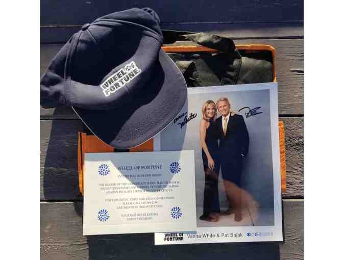 This package includes 4 Production Passes to a Wheel of Fortune taping at Sony Pictures Studios in Culver City, California, a Wheel of Fortune Gift Bag, an Autographed picture of Vanna White and Pat Sajak, a Wheel of Fortune ball cap, a Wheel of Fortune pen, and Wheel of Fortune keychain. There will be an additional fee of $3.99 added for shipping and handling.