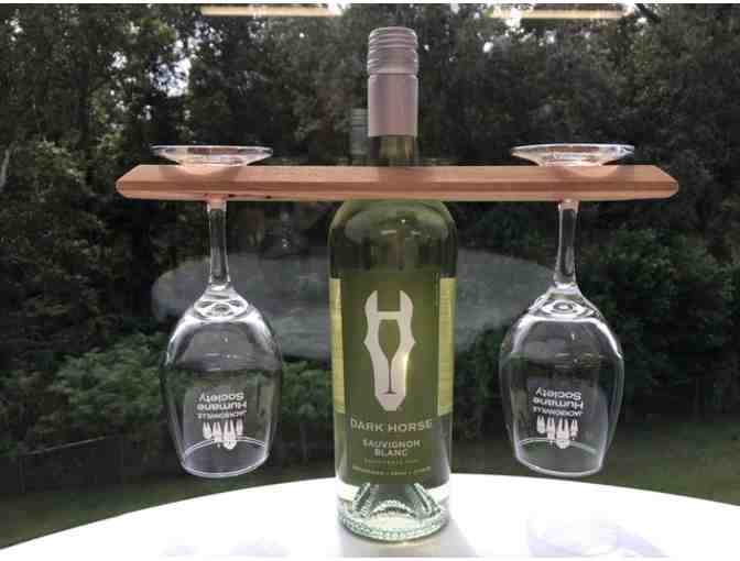Store your stemware in style! This handmade wine glass holder balances two glasses on any bottle of wine. This item includes the holder, two Jacksonville Humane Society glasses and a bottle of Dark Horse Sauvignon Blanc.