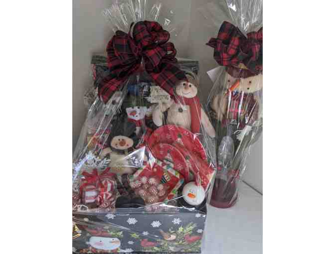 Christmas is coming! Basket includes: 23" snowman, 20" snowman, sitting snowman with dangling legs and 3 snowmen tins. Bottle of wine, candy and holder, festive paper plates and napkins, salt and pepper shaker and more!