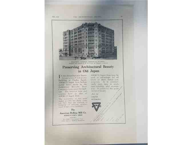 1925 Ad Osaka Japan. This original Am. Rolling Mill magazine ad from Jan 1925 issue of Architectural Record shows Daido Building in Osaka, Japan. It is clean and the heavy paper can easily be handled without crumbling. Measures 7" by 10.5" with slight variations due to page trimming. Good condition.