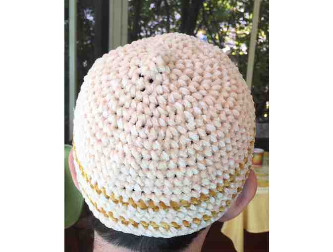 Hand Crocheted white velour Kippah with gold trim made by Kabbalist's daughter Chaya Poretsky