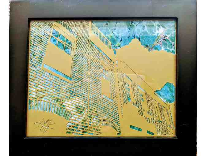 Handcut Paper architectural piece cut from one sheet of gold paper over a sheet of mainly blue marbled paper. 7 1/2 x 9 3/4. Framed under glass. Framed piece is 10 x 12. There is a slight reflection in the glass of this photo.
