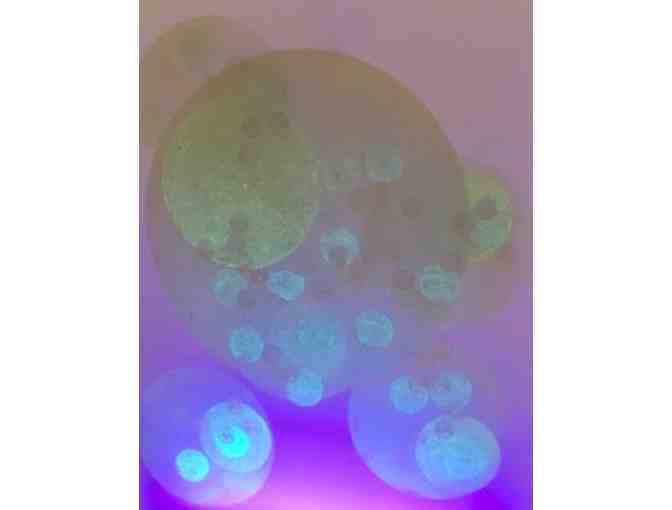 Ted Ollier’s piece truly captures the essence of many aspects of my research. A luminous glow is revealed in his print only under specific lighting conditions. The interaction between the light source and the minerals printed on the page leads to the emission of distinct glowing colors. The end result is simple and elegant. In much the same way that nature has devised a beautiful way for scientists to unravel secrets in living tissue using lasers, here, the printmaker is giving us a glimpse of something “invisible” by simply using a black light.