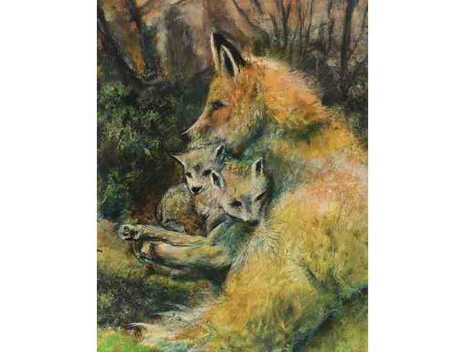 This oil on canvas painting of a Red Fox and Kits is 20" x 16" and by artist Marge Mount; the charming family leaps of the canvas.