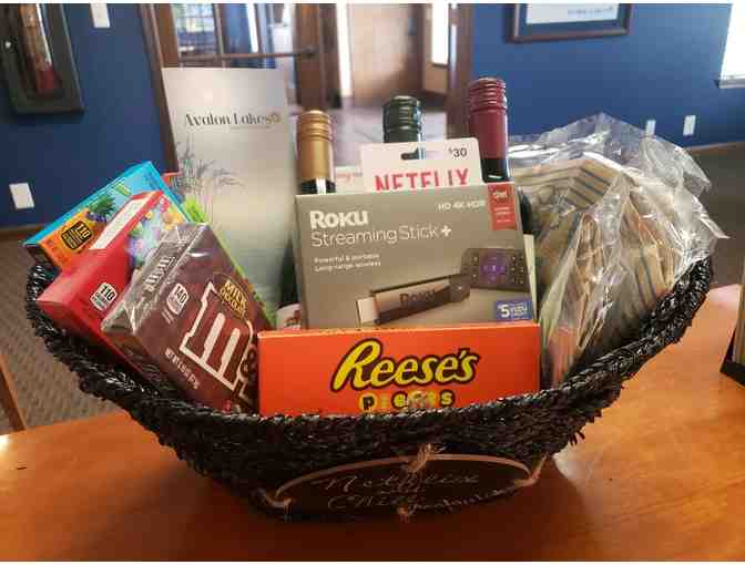 Gift Basket including Roku Streaming Stick Plus features smooth 4K/HD streaming to your TV. Its small form-factor makes it easy to hide behind your TV and perfectly portable to use while traveling. The included voice remote has buttons to control your TV power and volume, plus voice search and more. Wine, candy, popcorn, and a $30 gift card for Netflix.