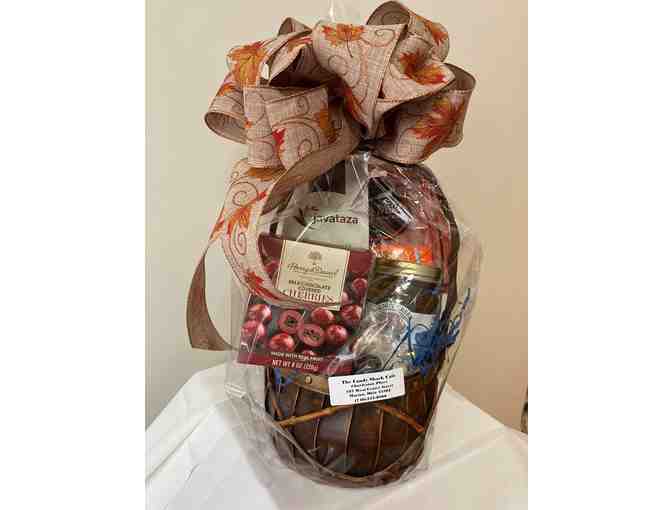 Gift Basket from Candy Shack filled with gourmet goodies: Harry & David Milk Chocolate Covered Cherries, Assorted Chocolates, Walnut Creek Pepper jelly, javataza French Vanilla Coffee, Uncle Mike's Beef Jerkey Value $50.00.