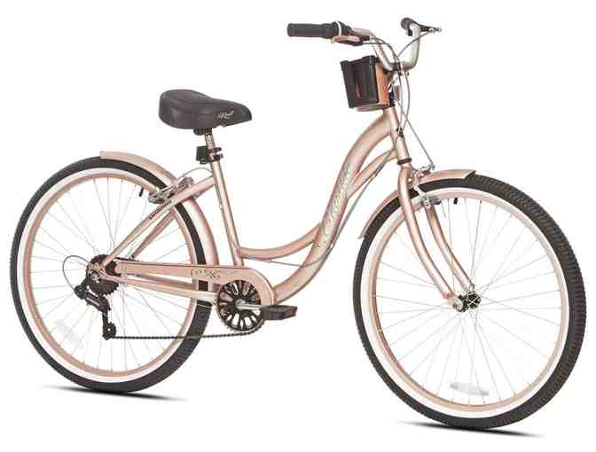 Looking for the perfect bike? Kent 26" Bayside Women's Cruiser Bike: Bike features a pretty (Rose Gold) over-sized step-through steel frame, 7 speed drive-train, twist shifters, Front and rear linear pull handbrakes, saddle chain guard, fenders included. Helmet and bike lock round out this package.