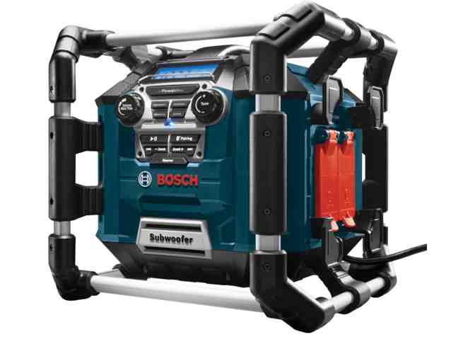 Bosch Power Box 18-volt Water Resistant Cordless Jobsite Radio. features Bluetooth technology to connect to the user's smart device (with a range of up to 150 Ft.) and stream Internet radio and stored music. This portable, high-performance, weather-resistant entertainment system delivers 360° enriched stereo sound. Its four-way speakers and a subwoofer provide outstanding sound quality in all directions. It is durable, with an aluminum/rubber roll cage and a weather-resistant design. The portable radio features a powered USB port. The Bosch Power Box can be powered by Bosch 18 V Lithium-ion batteries or plugging into a 120V outlet. Its built-in battery charger will charge the user's Lithium-ion batteries as well. The PB360C also features four 120V power outlets for connecting tools or other devices. ($200 value).
