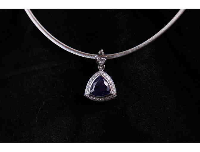 14 karat white gold satin finish round omega style necklace with an 18 karat white gold pendant set with a very fine triangular rich violet blue Tanzanite, weighing 7.16 cts.